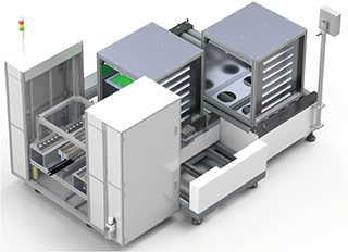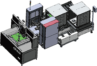 大型基板や小型基板(複数枚)をパレット内にセットし、搬送マガジンラックからパレット供給され、指定部品のリワーク交換をさせる自動システム。