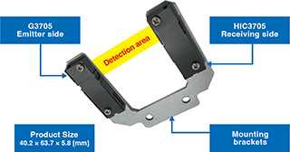 The product is equipped with a light emitter and a light receiver, which can detect the size of an object (such as a coin) inserted between them with high accuracy and high speed. Customization of area size, detection algorithm and output format (UART communication) are possible upon request
