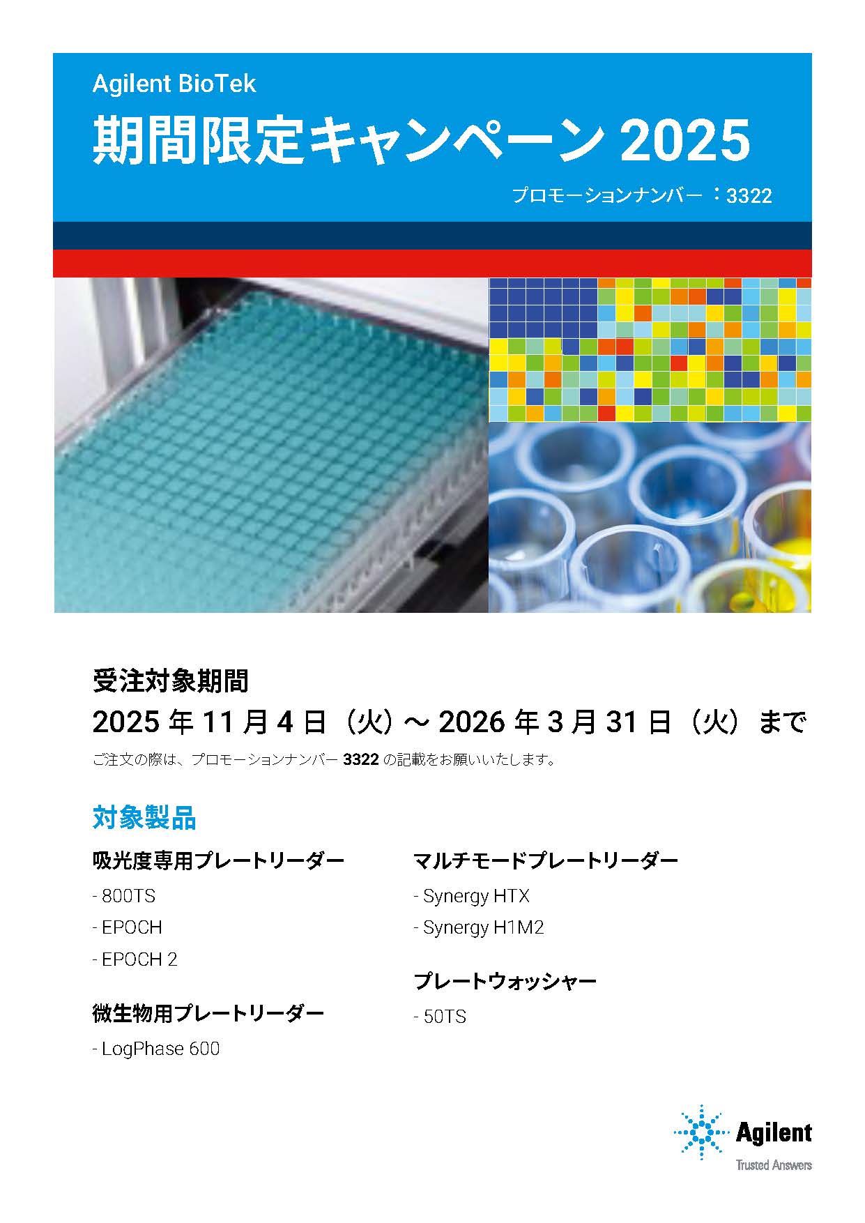 期間限定でマイクロプレートリーダーのキャンペーンを実施しております。 アジレントの各種マイクロプレートリーダーをこの機会にご検討ください。 受注対象期間 2025年11月4日(火)~2026年3月31日(火)まで 対象製品 吸光度専用プレートリーダー 800TS EPOCH EPOCH 2 マルチモードプレートリーダー Synergy HTX Synergy H1M2 微生物プレートリーダー LogPhase 600 プレートウォッシャー 50TS リーフレットはこちら 製品の詳細はこちら |